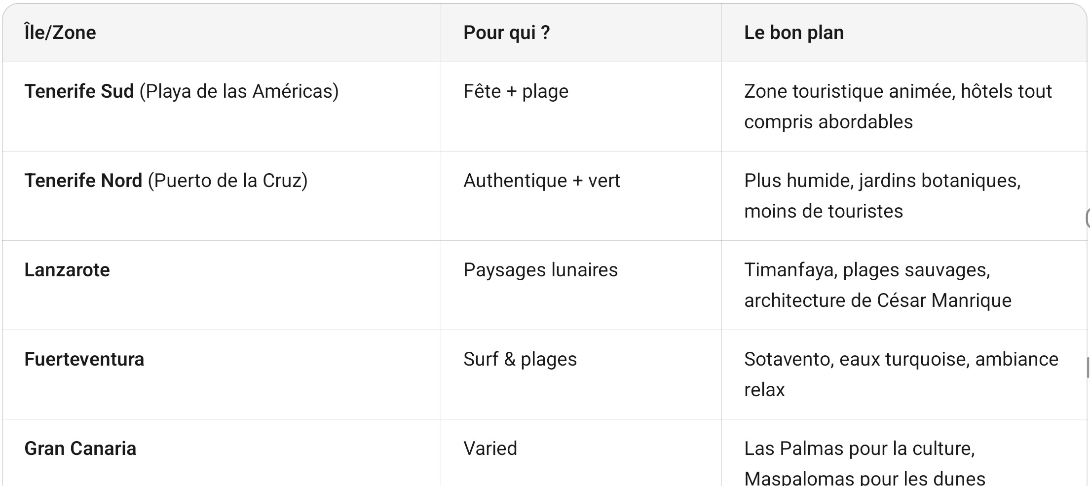 Le climat : Le « printemps éternel ». 20-25°C toute l’année, peu de pluie. L’archipel offre des micro-climats — du désert de sable aux forêts de pins.