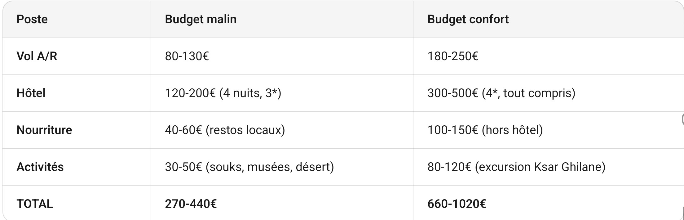 3️⃣ Budget moyen (5 jours/4 nuits)