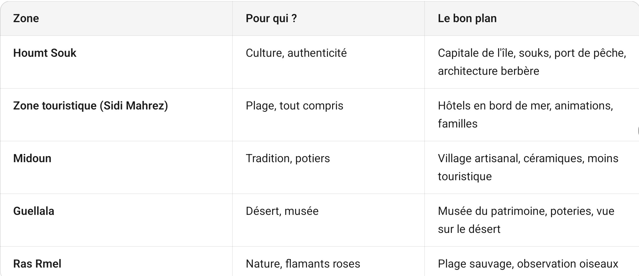 Le climat : Île du sud tunisien, climat désertique sec. Hivers doux (16-20°C), étés très chauds mais ventilés. Soleil quasi permanent.